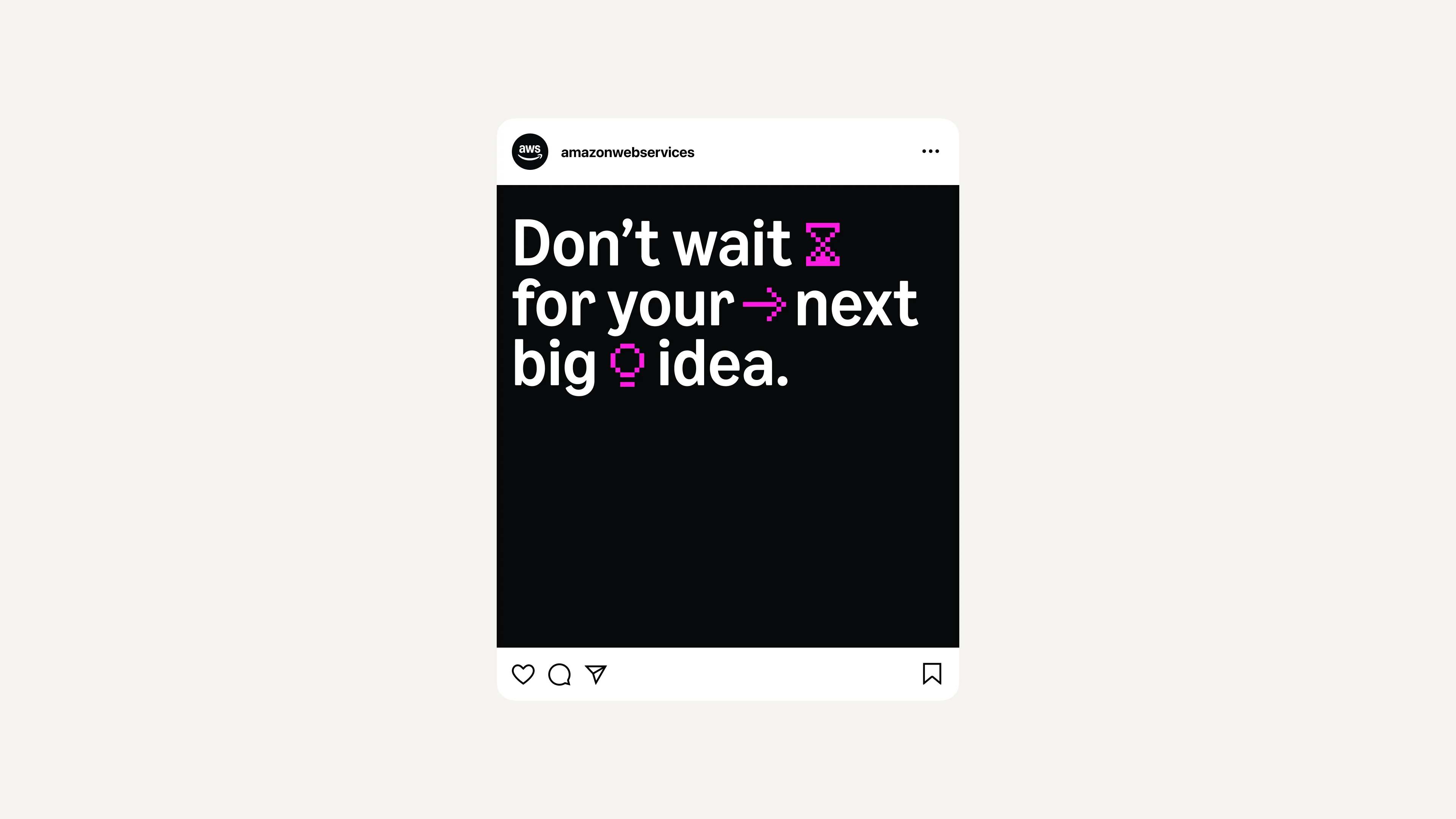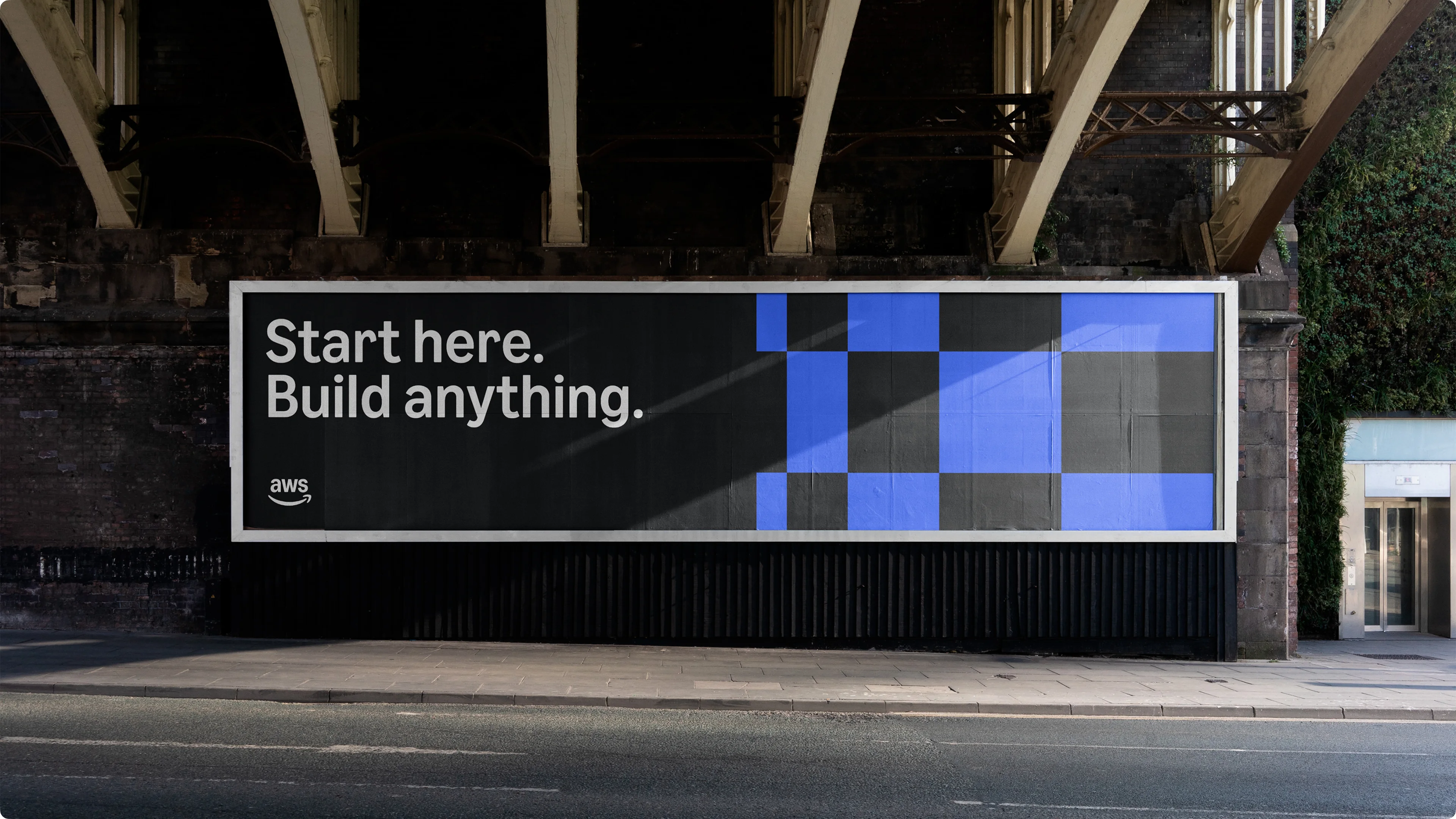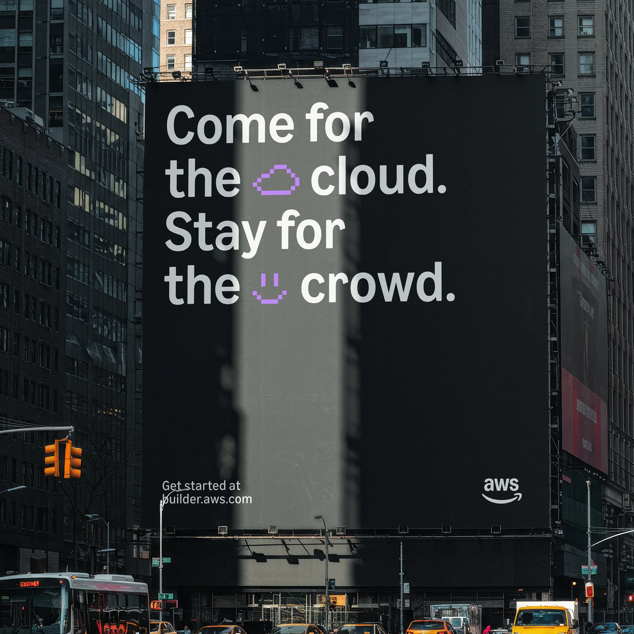 AWS is built for builders, but the brand hasn't always reflected that. I led creative direction and the development of a visual toolkit that extended the core AWS identity with a system designed specifically for technical audiences. The pixel motif references AWS’s core idea of building blocks and echoes the grid structure of the original logo. The visual language uses motion, dark-mode foundations, and sharp color accents to create a modern, developer-friendly expression with small, intentional details throughout.